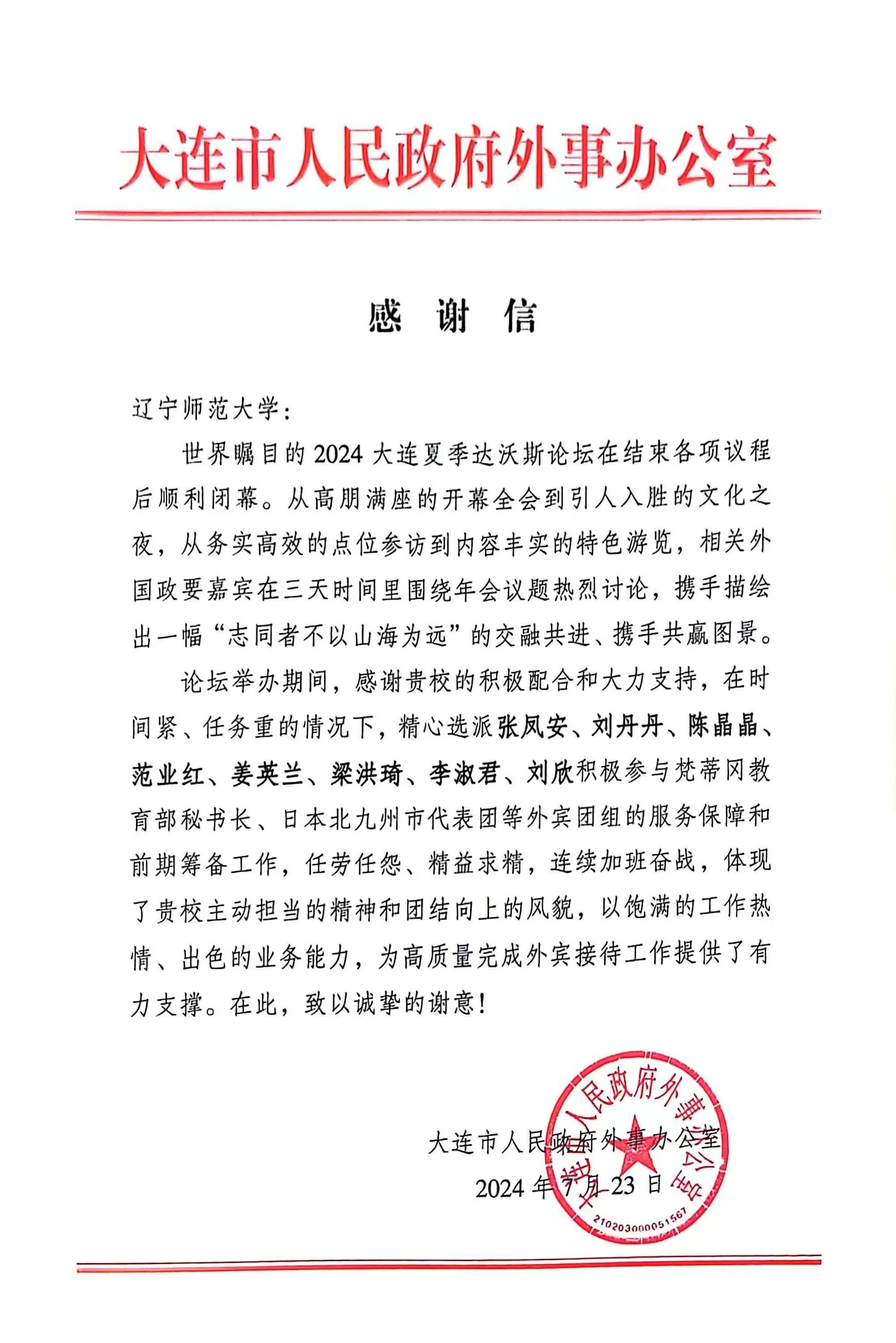 在此次盛会中,开元体育官方网站登录入口共有7名教师组成服务团队,高质量完成了各项服务保障任务,展现出了出色的业务能力和外事服务水平,得到了外国政要嘉宾的肯定,同时也得到了上级部门的表扬,收获了来自大连市人民政府外事办公室的感谢信。