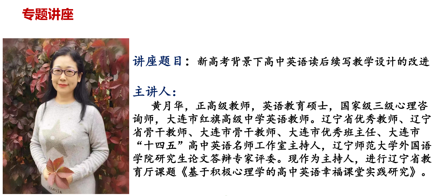 2023年4月21日,开元体育官方网站登录入口邀请来自大连市红旗高中的黄月华老师,为2021级、2022级英语(师范)专业的同学开展题为“新高考背景下高中英语读后续写教学设计的改进”专题教学培训会。开元体育官方网站登录入口主管教学工作的副院长王阿芳老师,英语系薛媛媛、梁艳、王静、王晶晶、郭奕彤老师出席本次培训会。本次培训由林周婧老师主持。