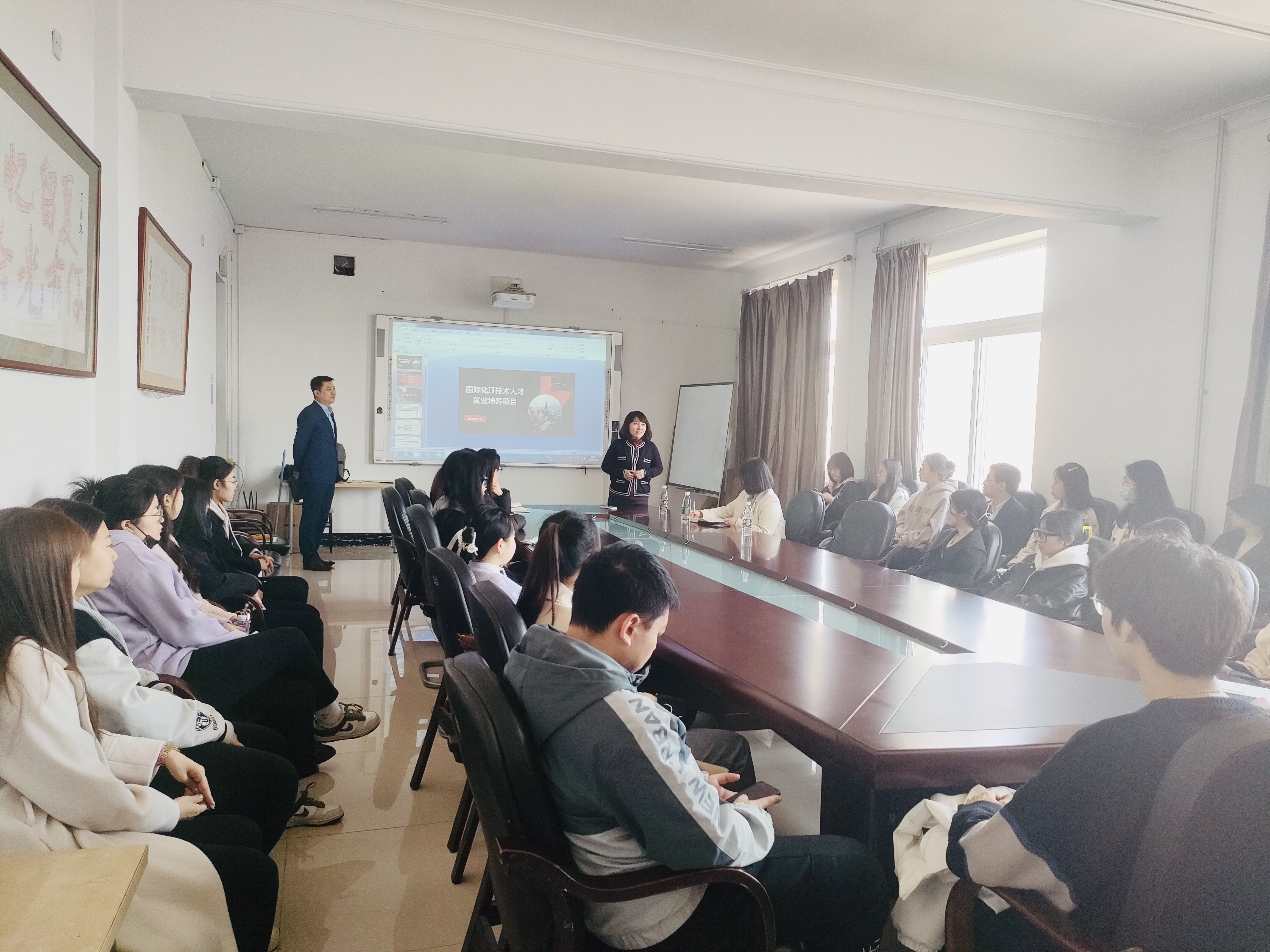 日本东和集团大连事务所执行所长黄欢向同学们介绍了行业现状和公司概况,并就集团国际化IT技术人才就业培养项目和相关培训课程、合作企业进行了详细的讲解。在自由提问环节,黄老师就学生关心的问题进行了解答,会议氛围十分热烈。