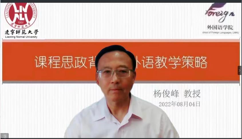 课程思政源起于习近平总书记在全国高校思想政治工作会议上关于“使各类课程与思想政治理论课同向同行,形成协同效应”的重要论述。当前,作为外语教师如何将课程思政融入外语课堂教学当中,成为广大教师深思的问题。鉴于此,为助力开元体育官方网站登录入口课程思政建设,进一步落实立德树人根本任务,2022年08月04日,开元体育官方网站登录入口特邀请大连外国语大学原副校长杨俊峰教授开展了题为《课程思政背景下外语教学策略》的讲座。本次讲座由开元体育中国官方网站副院长范业红主持。