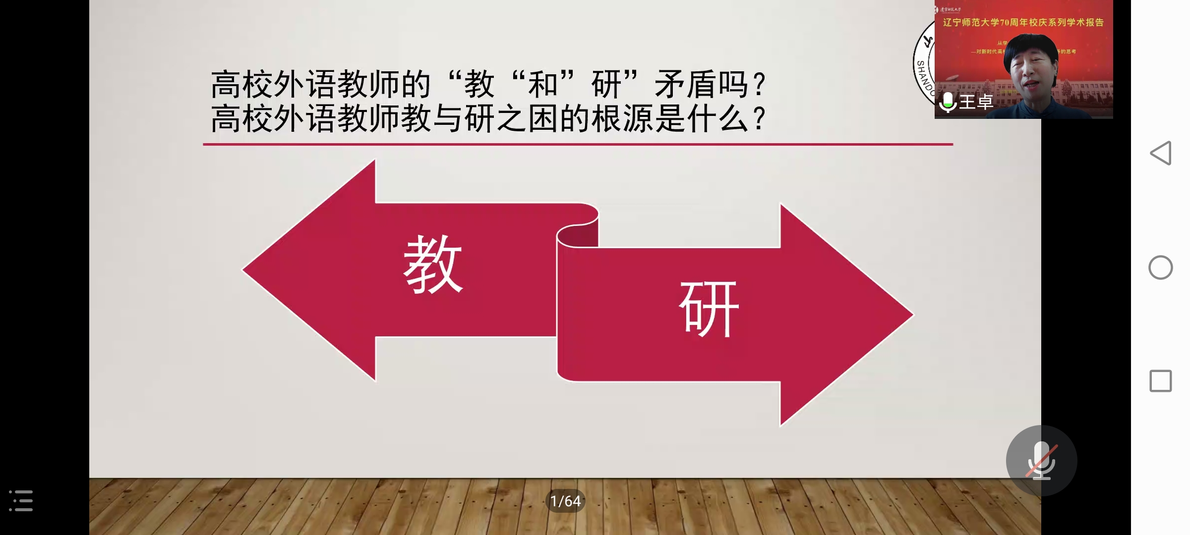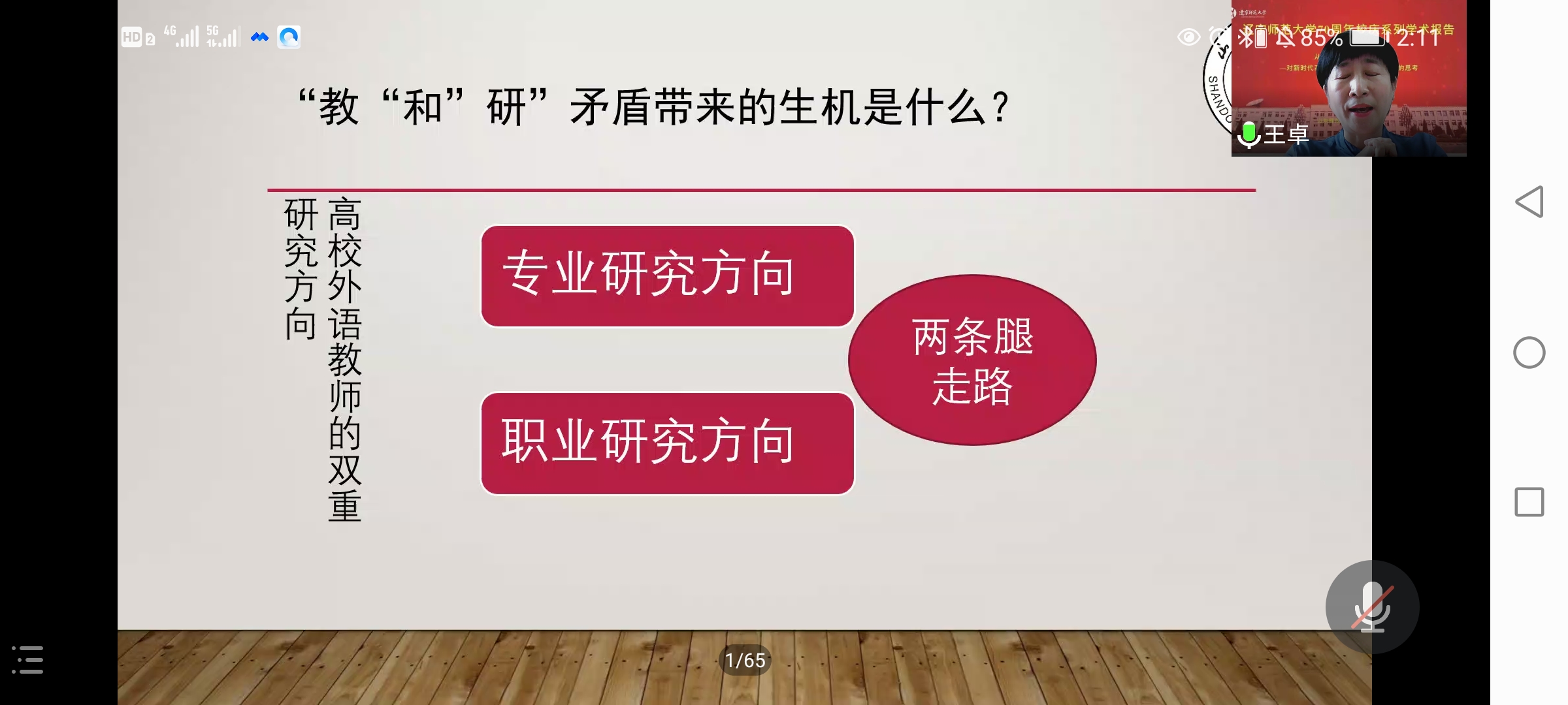 就新时代高校外语教师如何提高自身科研能力的问题,王卓教授首先认为如今高校外语教师会有更大的压力,当中的一个原因在于“教”和“研”的矛盾性,但王卓教授也提出,从另一个角度来看,这些冲突与矛盾也会为高校外语教师所面临的困境带来新的生机:即从专业研究方向和职业研究方向两个方面入手,不断提升自己,真正实现“用两条腿走路”。