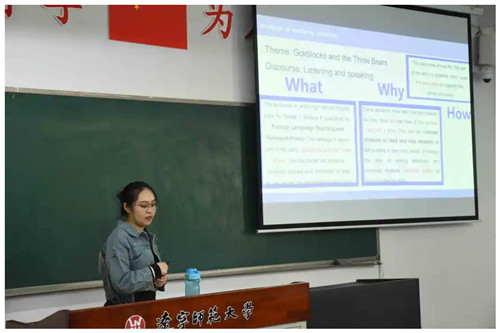 公开课上,首先由2018级英语(师范)专业二班的温家育同学进行三分钟说课环节和十分钟微课教学展示。温家育同学以生动有趣的形式展示教学内容,现场同学听讲认真专注。