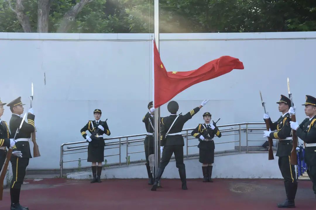 庄严的升旗仪式拉开帷幕,全体师生挺拔肃立,精神抖擞。升旗手们护卫着鲜艳的五星红旗,着装整齐、步伐坚定地正步走向升旗台。随后,伴随着《义勇军进行曲》的响起,鲜艳的五星红旗冉冉升起,大家集体行注目礼,神圣、庄严的氛围感染着在场的每一个人。