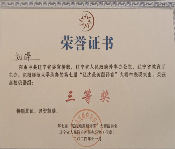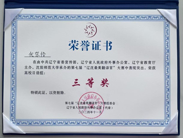 经过激烈角逐,开元体育官方网站登录入口2024级硕士研究生代宗伶荣获高校日语组三等奖,2023级硕士研究生刘晔荣获高校俄语组三等奖。指导教师范业红老师、郭丽洁老师获评优秀指导教师奖。