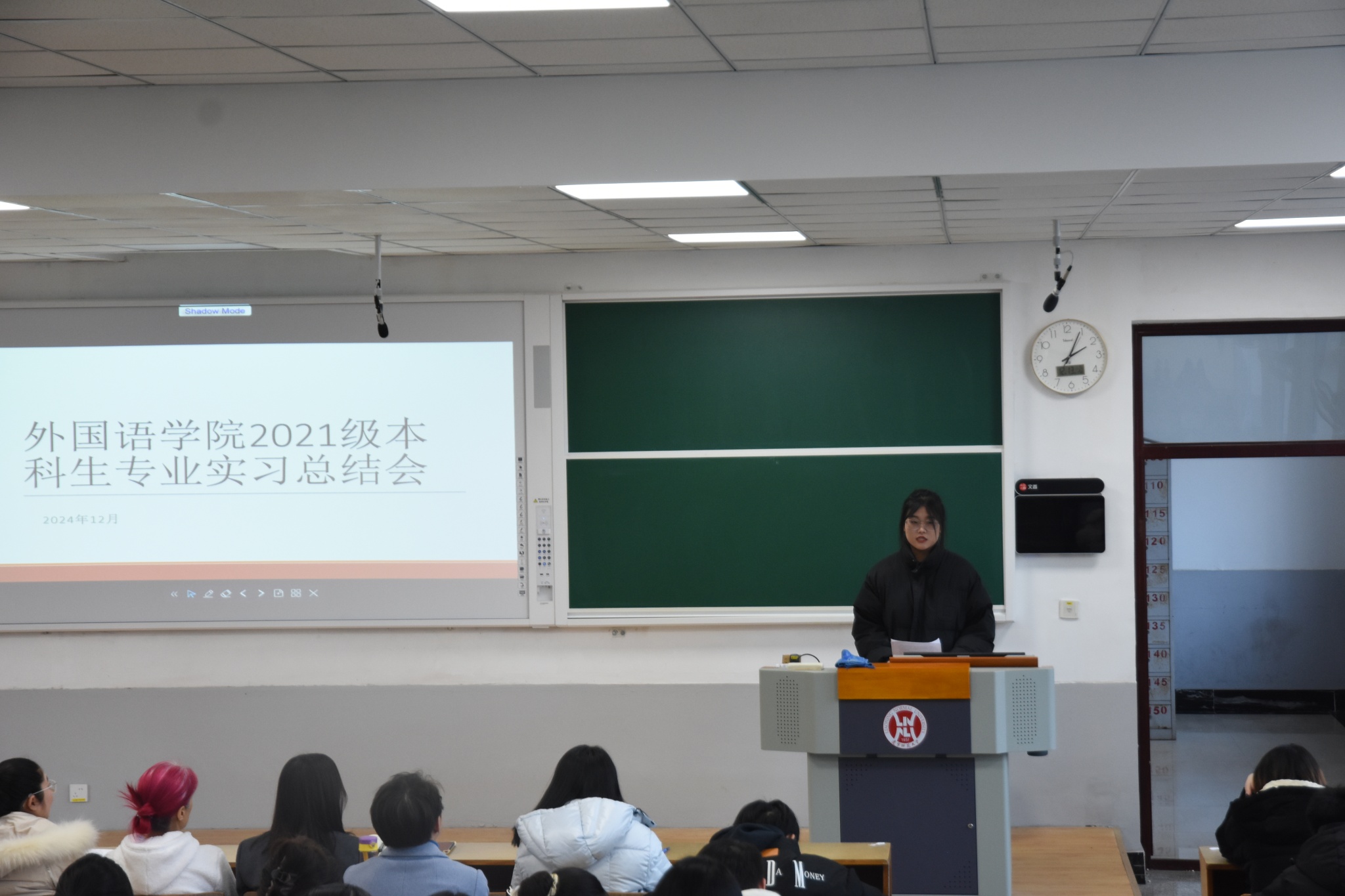 2024年12月13日下午,开元体育官方网站登录入口于外语楼三合召开2021级本科生专业实习总结大会,副院长刘丹丹,英语系教师赵东方、石洁,日语系教师苏畅,俄语系教师宋琳,法语系教师阎盛艳,教学秘书刘昱含,2021级辅导员刘卓出席本次会议。