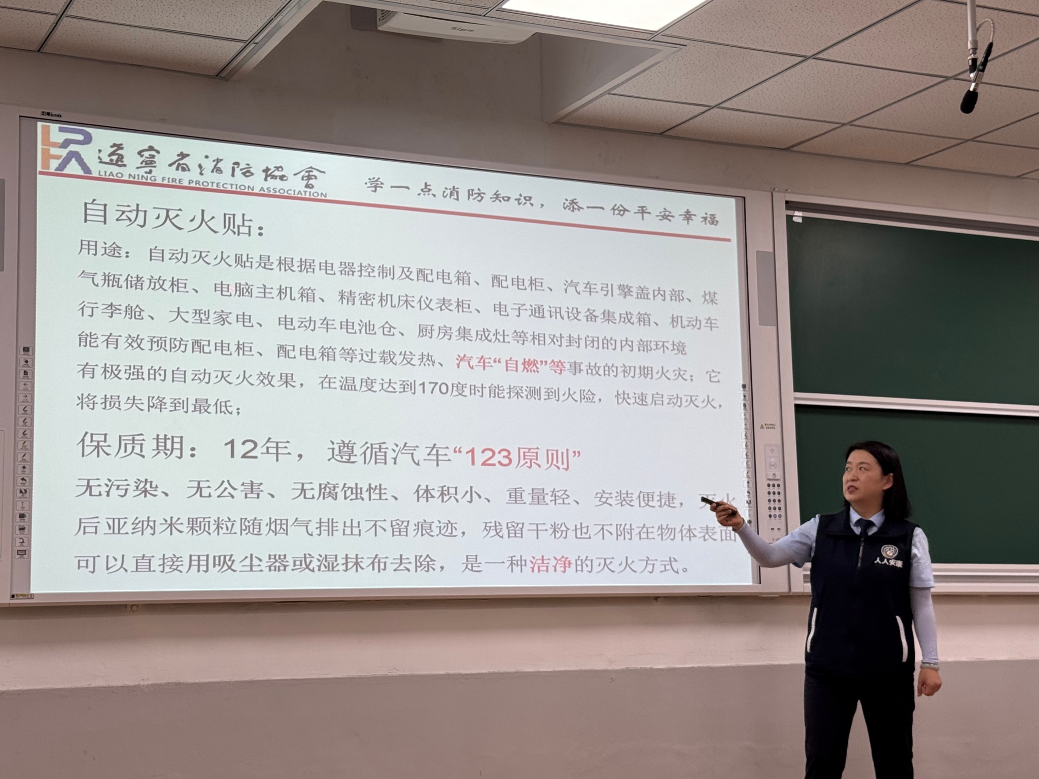 会议伊始,孙云笑书记向在场师生隆重介绍主讲嘉宾--辽宁省消防协会科普教育工作委员会高级教官沈红主任。沈红主任结合校园实际情况与典型火灾案例,深入剖析引发火灾的常见因素,如违规使用电器、出门忘断电、私拉乱接电线等,并着重强调学生宿舍和实验室是火灾高发区域,像忘记拔充电宝、在宿舍点蜡烛庆祝生日、夏天点蚊香等行为都极易引发火灾。在讲解过程中,沈主任详细阐述了各类灭火器的区别、适用场合、注意事项及使用方法,使师生们对灭火器的使用有了更清晰的认识。