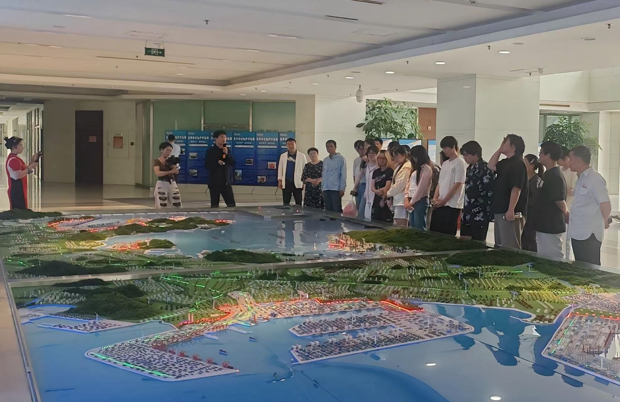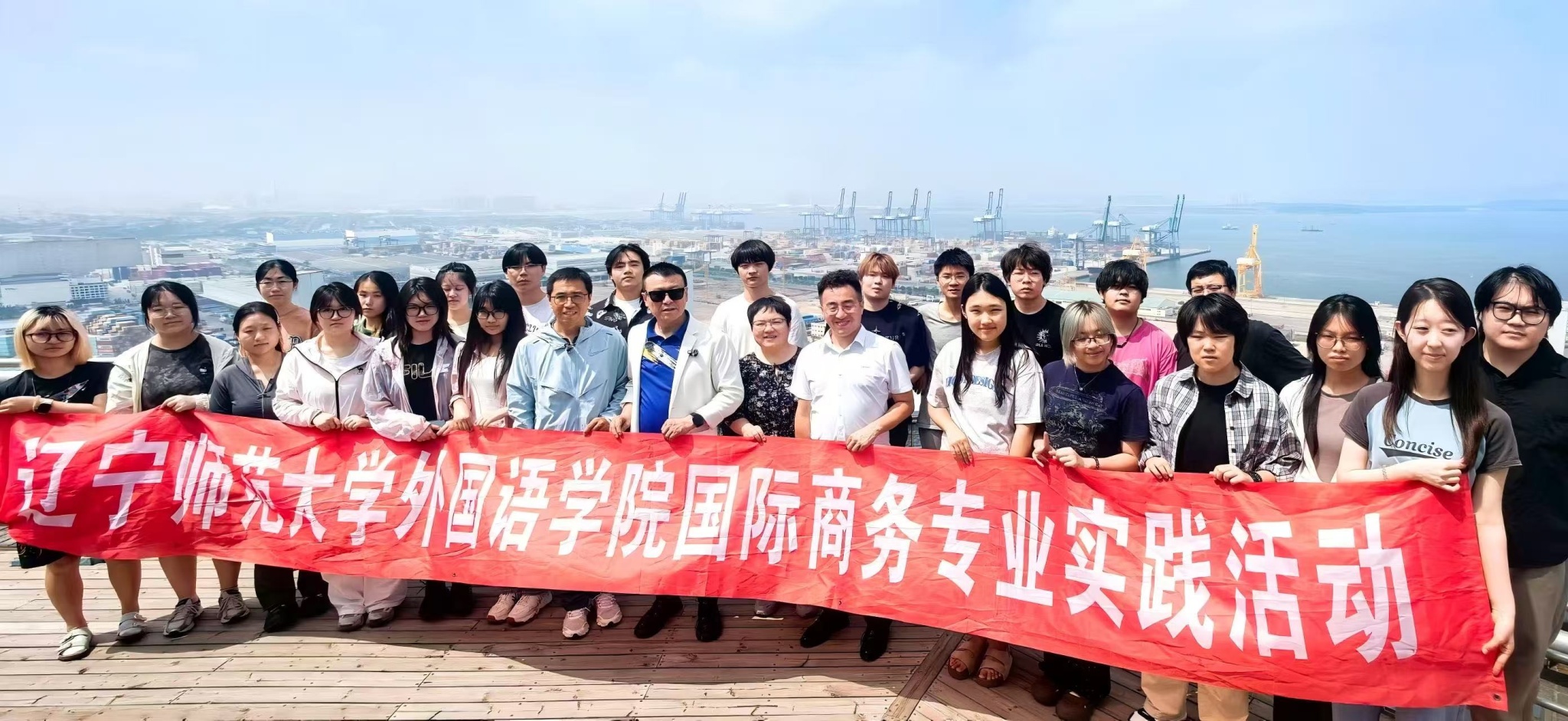 随后,师生一行前往大连新港商务大厦。在专业讲解员的引导下,同学们了解了辽宁省港口布局规划,学习了大连港的高效运作流程。在大厦楼顶观景平台俯瞰大窑湾各港口运作实况,直面感受港口贸易的运作场景,对港口经济在国际贸易中的重要作用有了更直观、更深刻的认识。